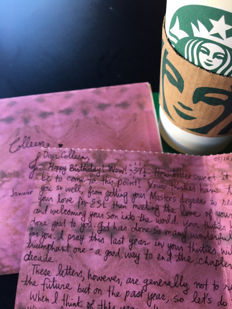 This is something I have been doing for over a decade now. I scrummage in my desk drawers and/or closet for the letter I wrote to myself a year prior, then I head to the local Starbucks for my free birthday drink and a quiet table where I can read the letter and reflect on what the last year meant to me.