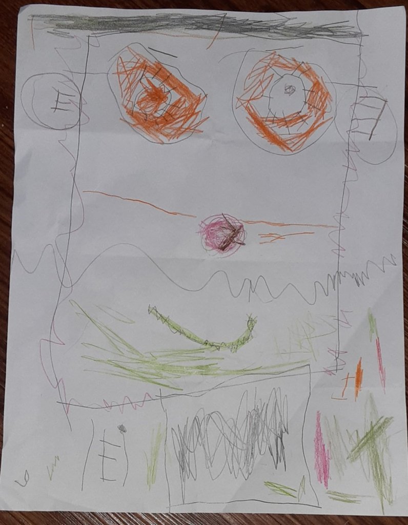 Fortunately, I’ve had a lot of practice twisting my arm behind the driver seat to give and take things from him over the years, so this was no different. I even managed to get a good look at his creation as we came to a stop at a light—a picture of a person he had drawn during art class that day.